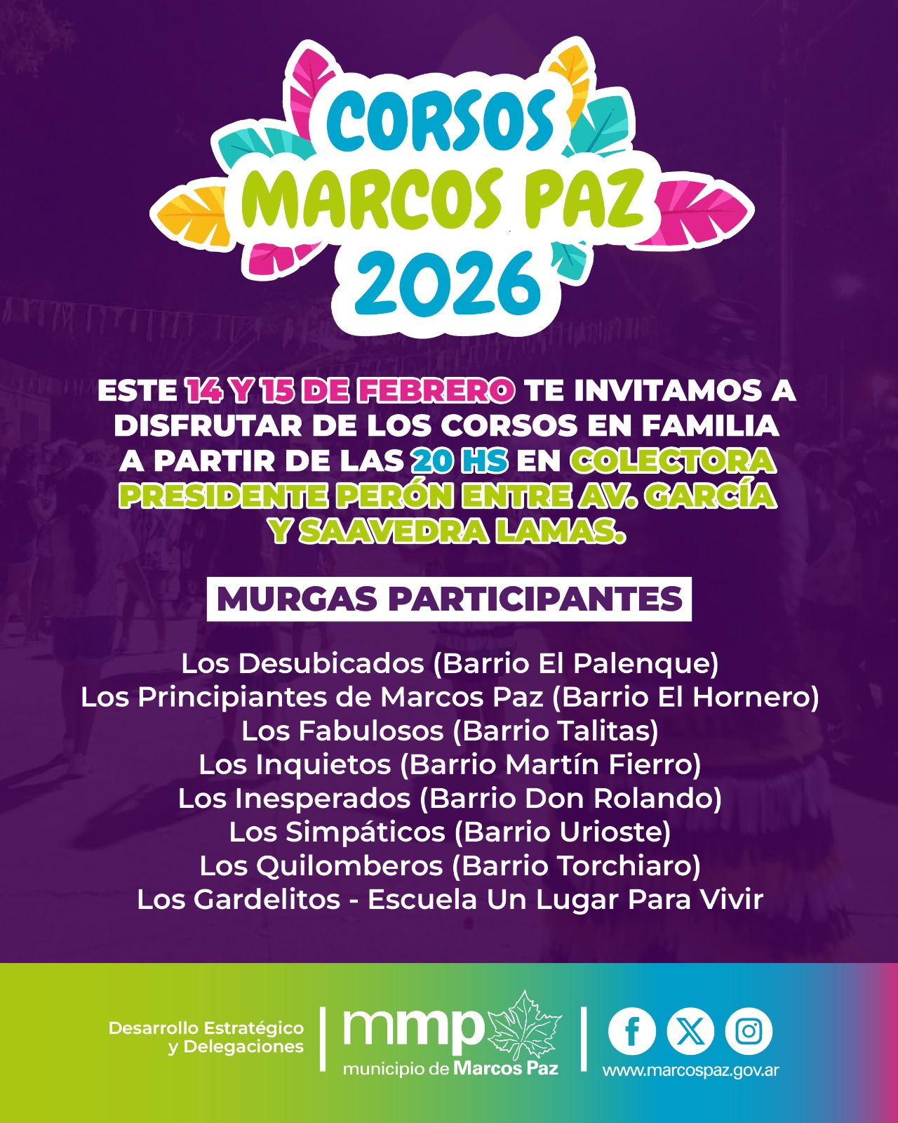 Este 14 y 15 de febrero, a partir de las 20 h, te esperamos para disfrutar de los tradicionales corsos en Colectora Presidente Perón, entre Av. García y Saavedra Lamas.