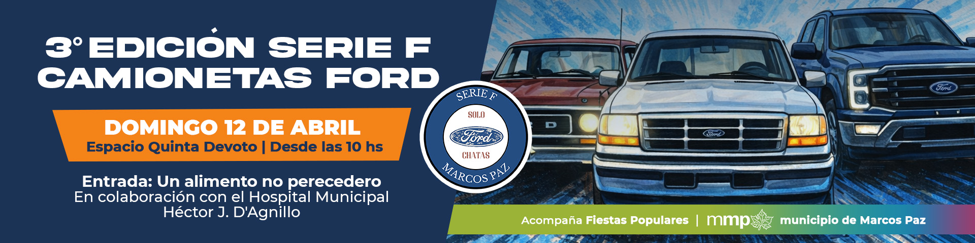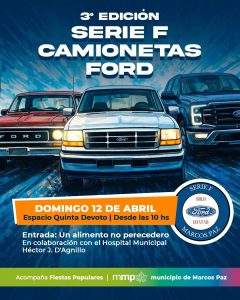 El domingo 12 de abril desde las 10 hs, llega a Marcos Paz la 3° edición de la Serie F – Camionetas Ford, un encuentro para disfrutar de modelos clásicos y actuales en el Espacio Quinta Devoto - Ruta 40 y KM 50